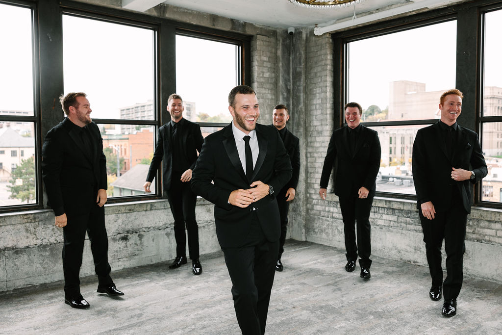 The ceremony took place in Grand Rapids, followed by a reception at The High Five GR, a venue known for its warm, rustic atmosphere and spacious layout. For a mid October wedding in West Michigan, it offered the perfect balance of cozy and refined. The exposed brick, wood accents, and open floor plan gave guests plenty of room to gather, dine, and celebrate comfortably.